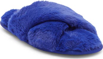 Keep your feet warm and cozy in this crisscrossed slipper made from plush faux fur.