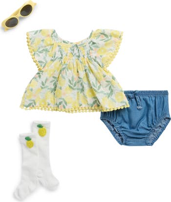 Scalloped embroidery and soft ruffles sweeten baby's wardrobe with this Swiss dot set featuring a babydoll top and a pair of coordinating bloomers. Embroidered socks and lightweight sunnies finish this whimsical look.