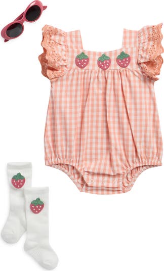 Scalloped and embroidery ruffles sweeten baby's wardrobe with this coordinated set featuring a bodysuit with coordinated socks and lightweight sunnies to finish this summertime set.