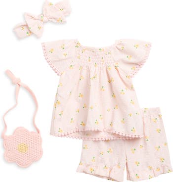 Scalloped embroidery and soft smocking sweeten baby's wardrobe with this seersucker set featuring a babydoll top and a pair of coordinating shorts. A bow-topped headband and matching knit bag finish this whimsical look.