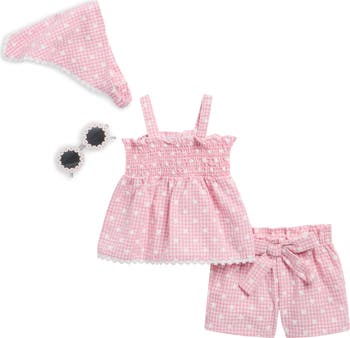 Baby is set for a picture-perfect moment in this floral-embroidered gingham-seersucker set featuring a babydoll tank, matching bow-waist shorts, a bandana-style headband and a pair of round sunnies.