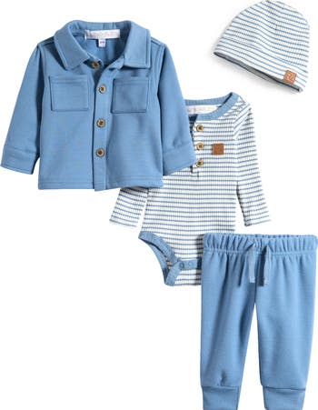 Baby will be ready for chilly days in this set featuring a solid shacket, a striped bodysuit, some joggers and a hat.