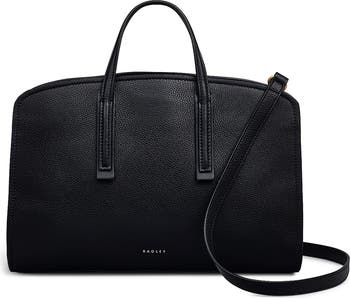 Richly textured pebbled calfskin leather adds sophisticated polish to a structured satchel outfitted with rolled top handles and an adjustable crossbody strap for versatile wear.