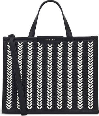 Chevron-woven two-tone leather adds polished sophistication to a spacious tote bag featuring a removable crossbody strap for versatile wear.