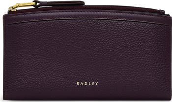 A curved topline shapes this grained-leather wallet outfitted with coin pockets, card slots and a spot for cash.