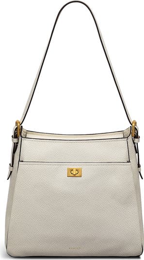 Clean lines and a structured profile define a medium-sized shoulder bag crafted from softly pebbled leather with an exterior slip pocket with a turnlock closure for easy organization.