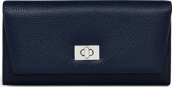 A gleaming logo adds brand distinction to a well-organized flapover wallet crafted from softly pebbled leather and sized to hold your cards, cash and coins.