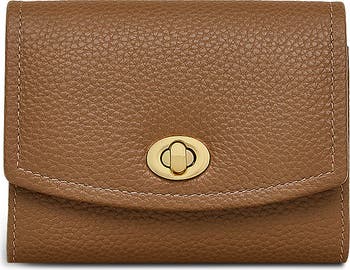 Keep your cards and cash organized and close at hand with this luxe pebbled leather wallet featuring a flap-over closure with a twist lock.