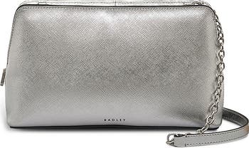 Textured metallic leather adds chic appeal to a scaled-down bag featuring a removable chain strap for versatile wear.