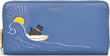 A whimsical surfboard appliqué and illustration charm a sensible leather wallet equipped with secure storage for cards, cash and coins.