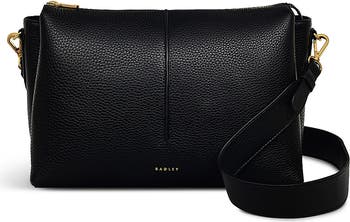 A wide crossbody strap offers comfy carry of a spacious crossbody bag constructed of grained leather and featuring separate interior sections for easy organizing.