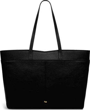A tote bag made from pebbled leather in a structured silhouette offers a sleek, functional style designed for taking to the office and the classroom.