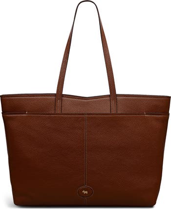 A tote bag made from pebbled leather in a structured silhouette offers a sleek, functional style designed for taking to the office and the classroom.