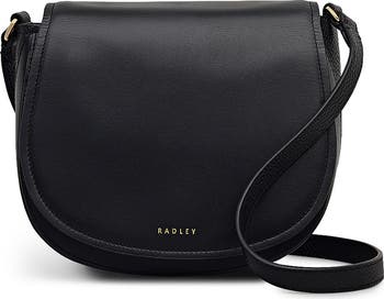 A subtle foil logo details the flap of this saddle-shaped crossbody made from durable leather and fitted with an adjustable strap.