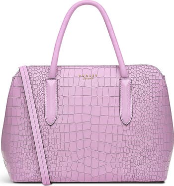 A croc-embossed texture lends depth and dimension to a spacious leather bag that can be carried by the top handles or crossbody strap for versatile appeal.