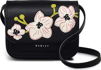 Floral appliqués add playful style to a leather top-handle bag featuring a crossbody strap for hands-free wear.