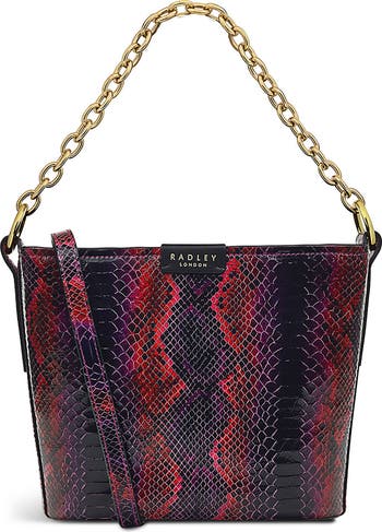 A snakeskin print and allover embossing lend a sultry vibe to a structured bag that features a chain handle and crossbody strap to mix up your carry style with ease.