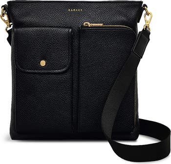 A gleaming logo adds brand distinction to this softly pebbled leather crescent bag designed with a slim, compact silhouette and plenty of pockets for your essentials.