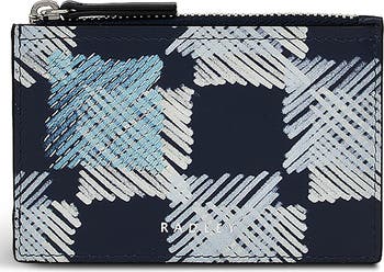 A scribble-check design with micro-stitch details define this smooth leather coin wallet that is perfectly sized for cards, cash and loose change.