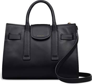 A mix of smooth and pebbled calfskin leather add sophisticated polish to a well-organized tote bag topped with rolled top handles and a removable crossbody strap for versatile wear.