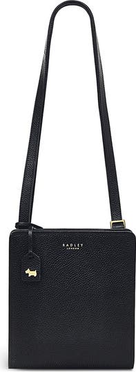 Signature Scottie dog hardware gleams inside a pebbled leather crossbody bag designed with an adjustable strap and multiple pockets for easy organization.