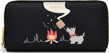 Keep all your cards and cash organized with this large leather wallet featuring the brand's signature Scottie roasting a marshmallow over a campfire.