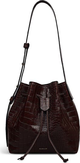 Croc-embossed faux leather with a water-resistant finish adds visual intrigue to this spacious bucket bag complete with a drawcord closure.
