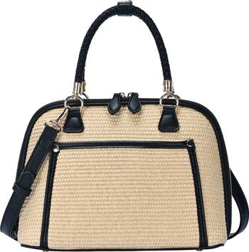 Contrast piping defines the sleek silhouette of this dome-shaped satchel set on a flat base with a surprisingly roomy interior. Braided top handles and gleaming hardware add elegant touches to the raffia-woven design.