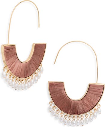 Raffia accents bring a summery vibe to these polished earrings edged with faux-pearl drops for an illuminating finish.