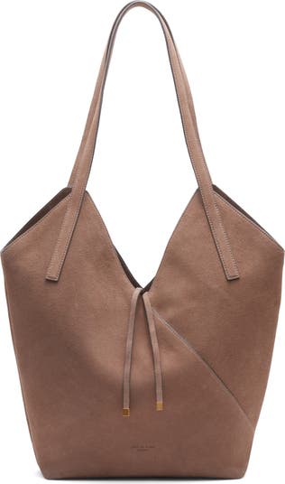 A notched topline and asymmetric seams bring sharp angles to a spacious tote shaped from supple suede and featuring a removable zip pouch for easy organization.