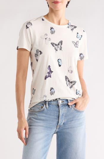 An allover butterfly print brings lively charm to this soft crewneck T‑shirt made of a cotton blend for easy, everyday style.
