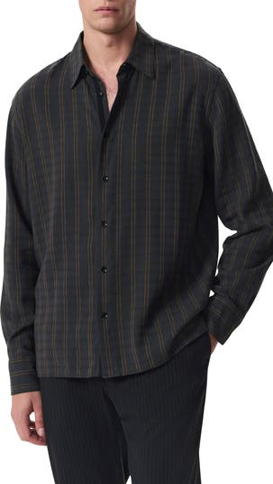 Take a closer look at this polished shirt–what looks like vertical stripes is actually a plaid pattern achieved by creating horizontal stripes with subtle, dimensional dobby stitches.