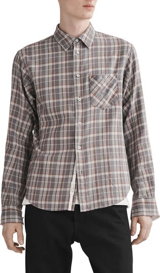 Welcome cooler days in this earthy-hued plaid shirt made from soft cotton and sized just right for layering.