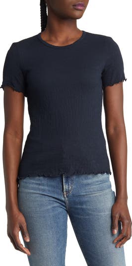 A subtle floral jacquard textures this body skimming T-shirt finished with lettuce edges and a raised back seam.