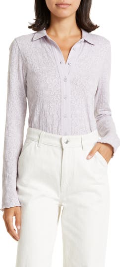 An understated floral jacquard details a lightweight shirt in a pale lilac hue finished with dainty lettuce edges.