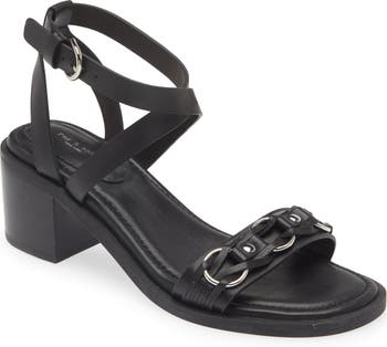 Polished hardware accents embolden the toe strap on a sleek leather sandal lifted by a stacked block heel.