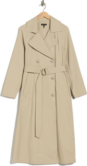 Crest buttons and a cinching D-ring belt update a staple trench coat cut from sturdy cotton twill.