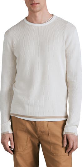 Solid trim elegantly frames this soft crewneck sweater knit from a cozy blend of cotton yarns.