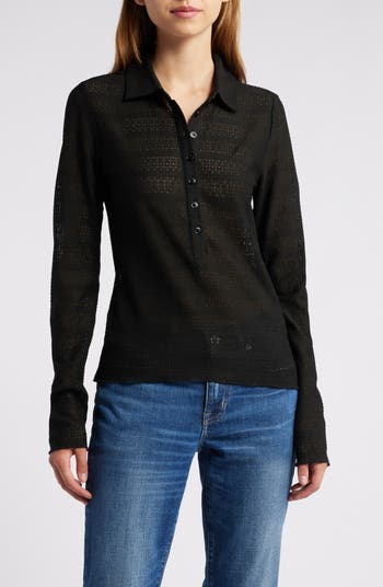 A lacy, textured knit gives breezy texture to a knit polo with a slim fit and a classic spread collar.