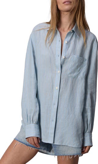Fine, faded stripes enliven this airy linen shirt designed with a relaxed, oversized fit that's finished with a curved shirttail hem.