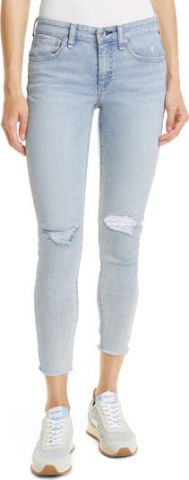 Ripped knees, frayed hems and a super-faded light wash makes these mid-rise skinny jeans perfect for your casual-cool style.