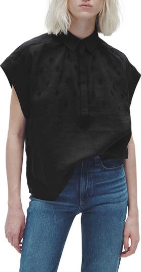 Subtle tulip-inspired embroidery decorates this airy half-placket top cut in a relaxed fit and designed with a spread collar and dolman cap sleeves.