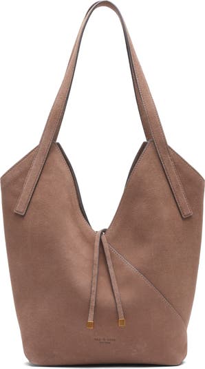 A notched topline and asymmetric seams bring sharp angles to a scaled-down tote shaped from supple suede and featuring a removable zip pouch for easy organization.