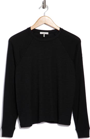 Ease into cooler days in lightweight stretch-blend pullover top finished with a textured raglan sleeves.
