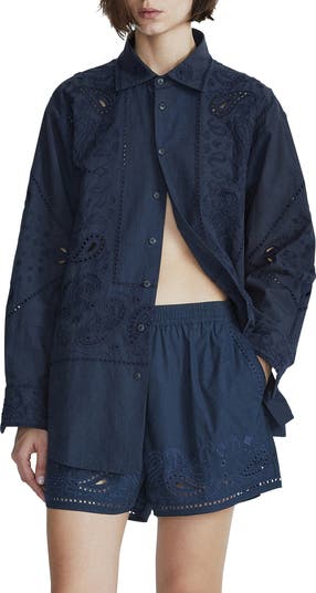 Embroidered paisley swirls enliven this oversized cotton shirt crafted with airy eyelets.