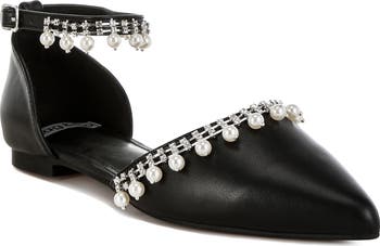Rhinestones and faux pearls give a street-savvy edge to this statement flat that boasts an adjustable ankle strap and elegant pointed toe.