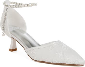 Dance the night away in this romantic corded lace d'Orsay pump secured by a removable faux-pearl ankle strap or wraparound ribbon ties.