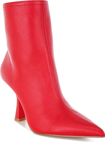 A slender architectural heel brings an artistic flourish to a pointy-toe bootie crafted from soft faux leather with a glossy finish.