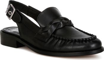 A braided strap details the upper of a charming slingback loafer framed by a moc toe and mini stacked heel.