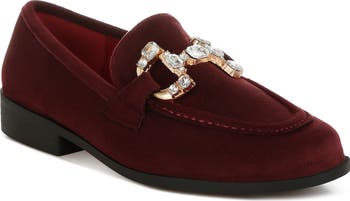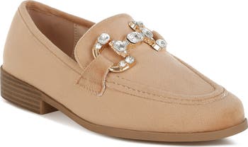 A crystal-adorned bit gives shimmer and shine to every step you take in this loafer that's lofted by a low block heel.